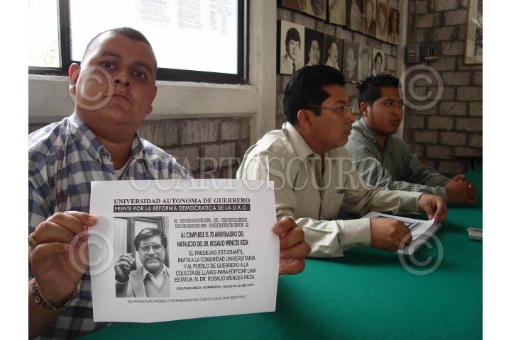 CHILPANCINGO, GUERRERO. 30AGOSTO2007.- Genaro Robles Jaimes, Renato Lopez Sonora y Francisco Velazquez Estrada integrantes del FREDEUAG estudiantil, durante la conferencia de prensa, donde hicieron una invitacion de la comunidad universitaria y a la poblacion en general para que participen en la colecta de llaves que llevaran a cabo las cuales serviran para la realizacion de una estatua en honor al ex rector de la maxima casa de estudios Rosalio Wences Reza. FOTO: OSCAR ALVARADO/CUARTOSCURO.COM