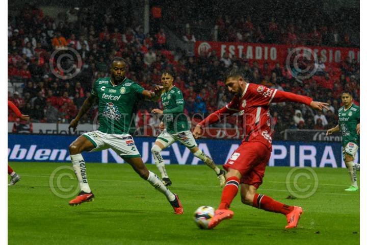 TOLUCA, ESTADO DE MÉXICO, 03FEBRERO2024.- Edgar López Delantero de los Diablos de Toluca y Jaine Barreiro defensa la escuadra del León en el partido correspondiente a la jornada 5 del Torneo Clausura 2024 de la Liga MX, en el estadio Nemesio Diez, teniendo un marcador final 4-1. FOTO: CRISANTA ESPINOSA AGUILAR /CUARTOSCURO.COM