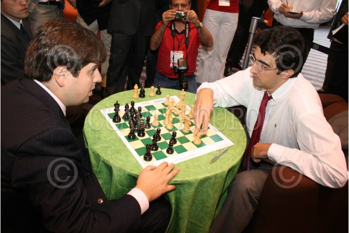MÉXICO. D.F. 13SEPTIEMBRE2007.-Peter Svidler y Vladimir Kramnik, disputan una partida en el Torneo Mundial de Ajedrez que se celebra en la ciudad de Mexico, donde cada judor planeara su estrategia para dejar en Jake a su oponente, además el certamen ofrece un torneo para los habitantes de la ciudad.