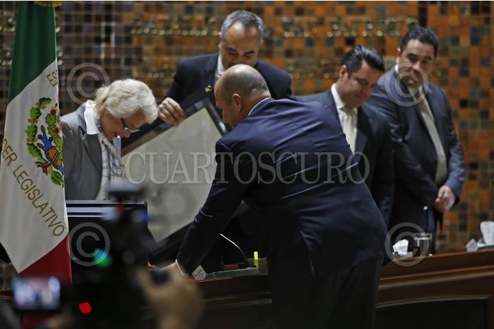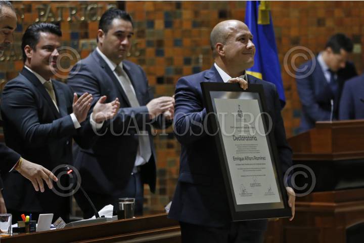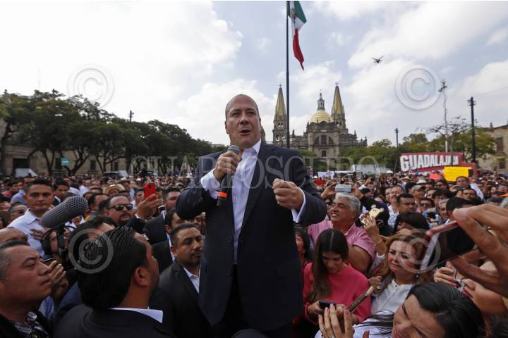 GUADALAJARA, JALISCO, 06DICIEMBRE2018.- Esta mañana en el Congreso del Estado Enrique Alfaro Ramírez tomo protesta como Gobernador de la entidad lugar al que se dieron cita Olga Sánchez Secretaria de Gobernación de la administración del Presidente Andrés Manuel López Obrador así como personajes de la política nacional, estatal, local, académicos universitarios y empresarios. Al terminó del acto solemne encabezo un pequeño mitin en la Plaza de la Liberación, lugar donde agradeció a los Jaliscienses su apoyo. FOTO: FERNANDO CARRANZA GARCIA /CUARTOSCURO.COM