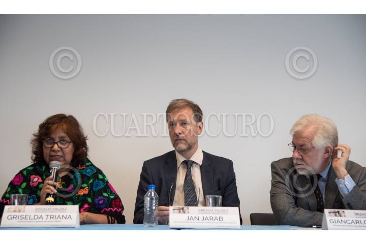 CIUDAD DE MÉXICO, 22MARZO2018.- Sylvain Estival, director de AFP México; Griselda Triana, comunicadora y esposa del periodista fallecido Javier Valdéz; Jan Jarab, alto comisionado de las Naciones Unidas para los Derechos Humanos, y Giancarlo Summa, director del Centro de Información de las Naciones Unidas, presentaron el premio “Breach-Valdez de Periodismo y Derechos Humanos”, en memoria de los periodistas Miroslava Breach y Javier Valdez, asesinados en 2017. El premio tiene como objetivo reconocer a periodistas por su compromiso con la defensa de la libertad de expresión y los derechos humanos; será entregado el 3 de mayo, día internacional de la libertad de expresión. FOTO: MARIO JASSO /CUARTOSCURO.COM