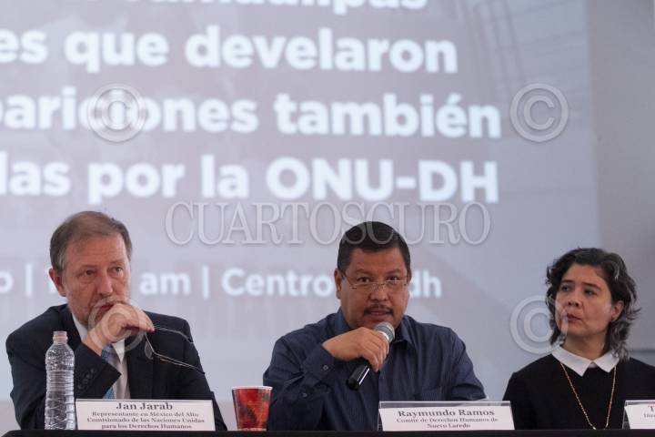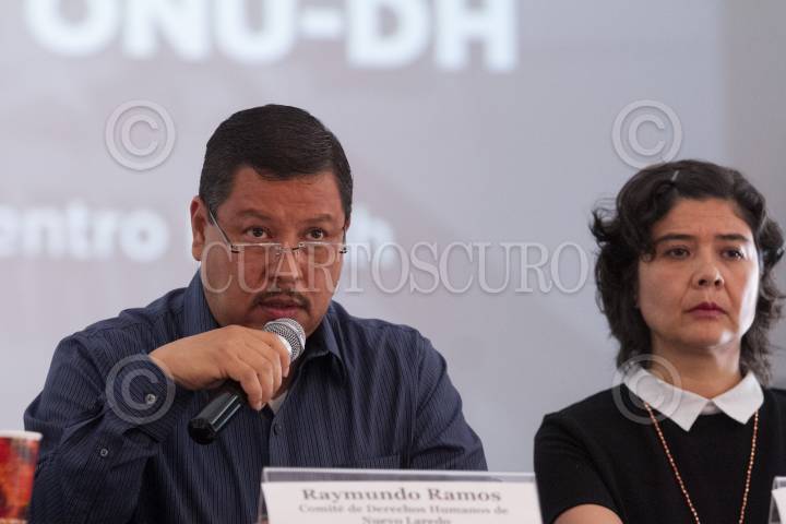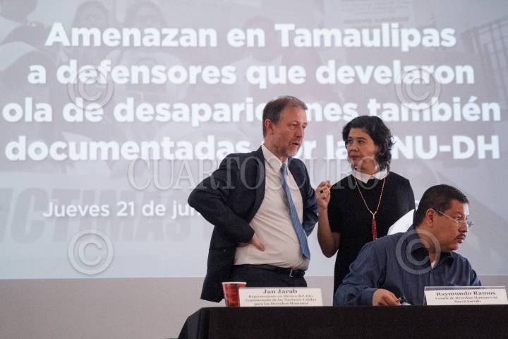 CIUDAD DE MÉXICO, 21JUNIO2018.- Jan Jarab, representante en México del Alto Comisionado de la Naciones Unidas para los Derechos Humanos; Raymundo Ramos, comité de Derechos Humanos de Nuevo Laredo, y Tania Reneaum, directora ejecutiva de Amnistía Internacional México, durante la conferencia de prensa "Amenazan en Tamaulipas a defensores que develaron ola de desapariciones también documentadas por la ONU-DH". Raymundo Ramos denunció que en diferentes cuentas de Facebook ha sido víctima de acoso en donde se le amenaza poniendo fotos de su esposa e hija relacionándolas con grupos del crímen organziado, también denunció una nota que salió en un periódico de circulación nacional en la cual se le señala de recibir un pago mensual de 5000 dólares por parte del crimen organizado a cambio de señalar a la Marina como la responsable de desaparciones forzadas en el estado de Tamaulipas, el defensor de derechos humanos apuntó a estos ataques a la Marina y dice que son en represalía a sus investigaciones del actuar de los elementos de la SEMA, especificamente en el caso de un ataque a una familia que fue agredida en su camioneta desde un helicoptero militar, del cual dio a conocer que cuenta con un video que esta resguardado en los Estados Unidos. FOTO: MOISÉS PABLO /CUARTOSCURO.COM