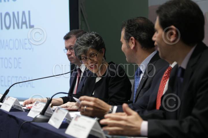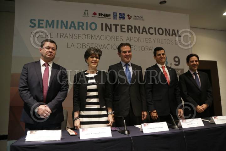 CIUDAD DE MÉXICO, 08OCTUBRE2018.- Javier González; Janine M. Orálora Malassis, presidenta a del Tribunal Electoral del Poder Judicial de la Federación (TEPJF): Lorenzo Córdoba Villalobos, consejero presidente del INE; Héctor Díaz Santana, titular de la Fepade, y Salvador Romero, durante inauguración del Seminario Internacional sobre Transformaciones, Aportes y Retos de la Observación Electoral, realizada en un hotel al sur de la ciudad. FOTO: ILSE HUESCA/ CUARTOSCURO.COM