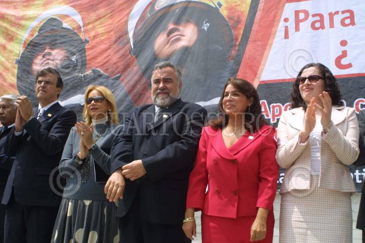 MEXICO, D.F., 28JULIO2005.- Marcelo Ebrard, secretario de Desarrollo Social D.F., Guadalupe Loaeza, escritora, Alejandro Encinas, secretario de Gobierno y Virginia Jaramillo, jefa delegacional de Cuauhtémoc, en la ceremonia de entrega de la segunda etapa de la nueva estación de Bomberos, ubicada en Insurgentes. FOTO: Ignacio Chávez/CUARTOSCURO.COM