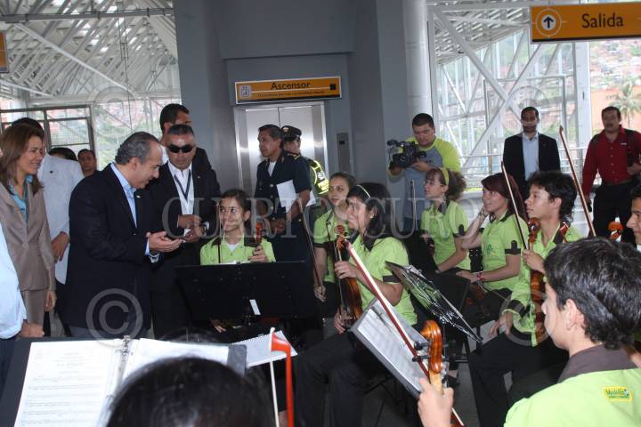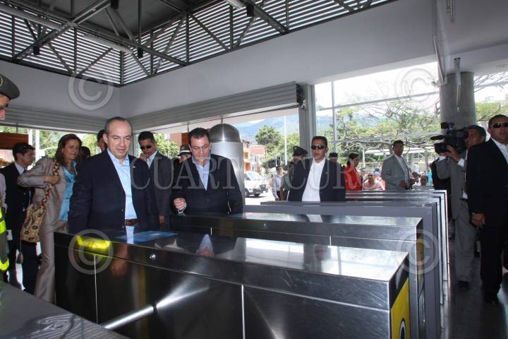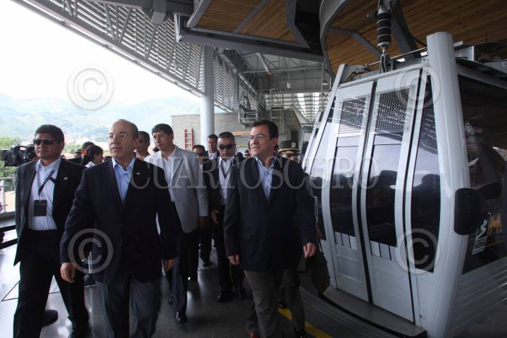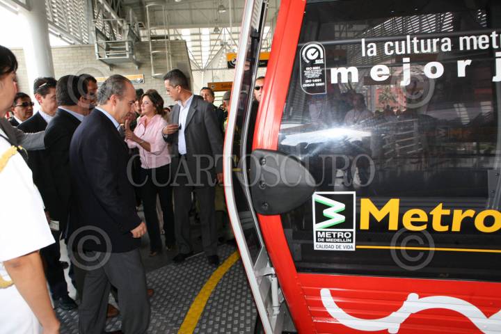 MEDELLIN, COLOMBIA 31MAYO2009.- Felipe Calderon Hinojosa presidente de México acompañado por su esposa Margarita Zavala y Alonso Salazar Jaramillo durante un recorrido por el metro cable sobre la columna 13 que tuvo lugar en la estación San Javier de la línea J del metro cable FOTO: ALFREDO GUERRERO/CUARTOSCURO.COM