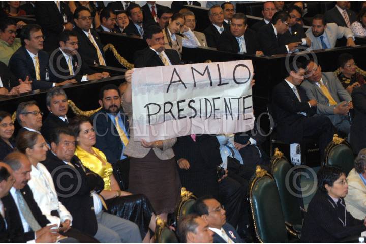 MÉXICO D.F. 17SEPTIEMBRE2006.- En la asamblea de representantes donde rindio su ultimo informe de gobierno, Virginia Jaramillo, muestra una pancarta donde proclaman a Andrés Manuel, presidente. FOTO: GUILLERMO PEREA/ CUARTOSCURO.COM