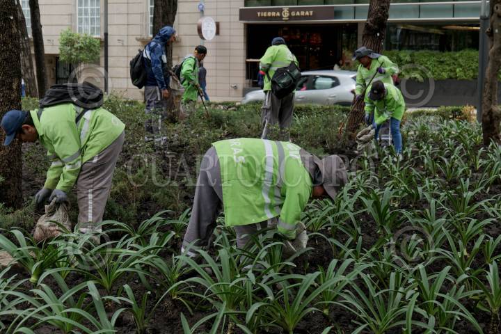 CIUDAD DE MÉXICO, 01JULIO2024.- Trabajadores de la Secretaria de Obras y Servicios hacen trabajos de jardinería en Avenida Paseo de la Reforma. FOTO: ALICE MORITZ/CUARTOSCURO.COM