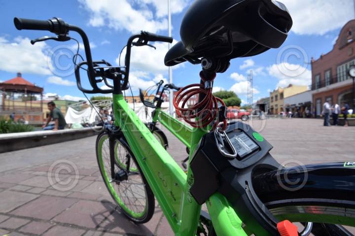 METEPEC, ESTADO DE MÉXICO, 03JULIO2018.- Los habitantes del Pueblo Mágico de Metepec tienen un nuevo servicio de transporte, con un programa piloto de bicicleta pública llamado VBike, se activa a través de una aplicación móvil y el cobro va de un día hasta una membresía por un año. Algunas bicicletas han sido colocadas en distintas partes del municipio para dar a conocer este programa. FOTO: ARTEMIO GUERRA BAZ /CUARTOSCURO.COM