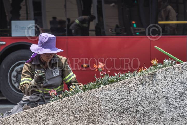 CIUDAD DE MÉXICO, 04JULIO2019.- Una mujer trabajadora de gestión urbana de la capital realiza limpieza del jardinero desgastado de avenida Paseo de la Reforma. FOTO: MARIO JASSO /CUARTOSCURO.COM