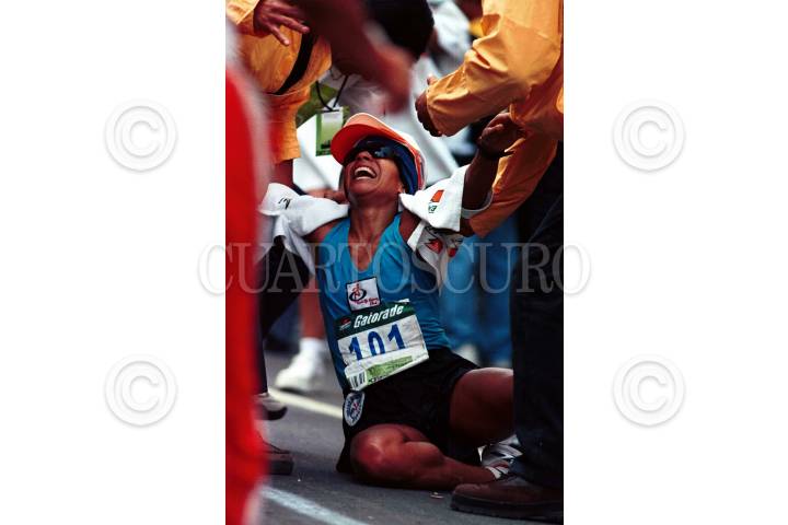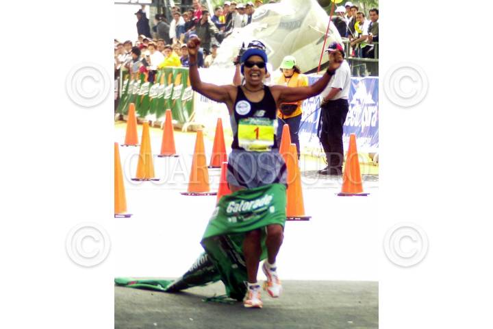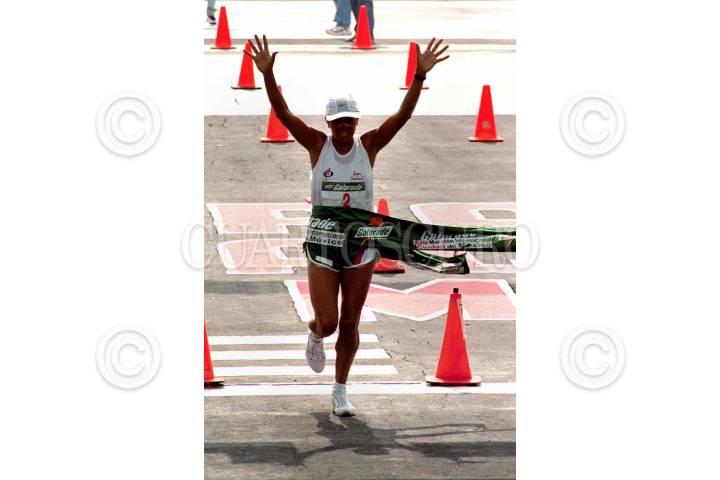 Patricia Jardón llega en primer lugar a la meta y se consolida como ganadora absoluta del XIX Maratón de la Ciudad de México en la categoria femenina. FOTO: David Bolaños/CUARTOSCURO.COM