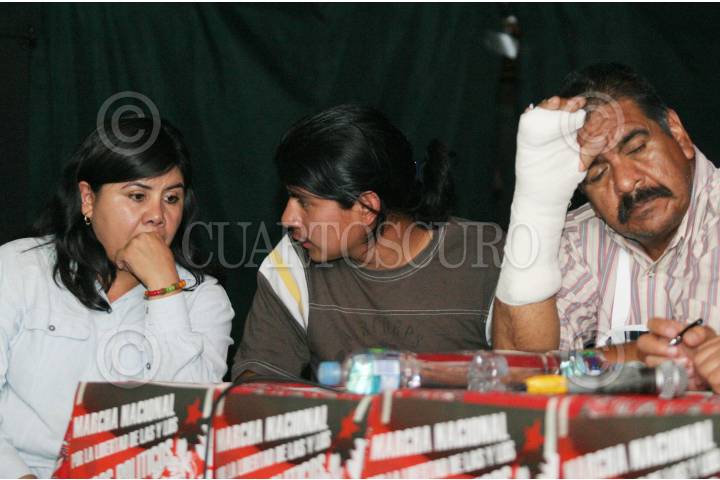MÉXICO D.F. 26MAYO2006.- Ofelia Oliva Quijano, trabajadora del IMSS, Edgar Santiago Navarro, estudiante de la Universidad de Chapingo y Jorge Salinas Jardón, habitante de Atenco, durante conferencia de prensa, ofrecieron sus testimonios de las anomalias cometidas por parte de las autoridades en contra de los presos políticos de San Salvador Atenco, en las instalaciones del Foro Alicia. FOTO: Diego Gallegos/CUARTOSCURO.COM