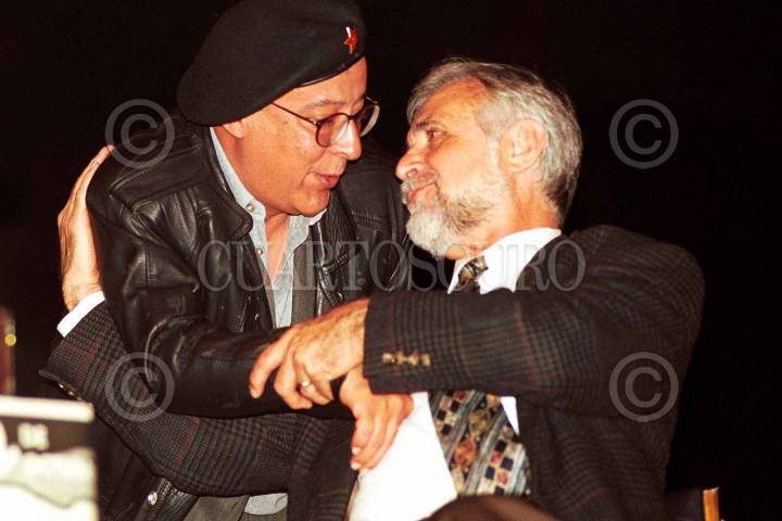 Raúl Jardón y Enrique Sémo; sobrevivientes de la matanza del 2 de octubre de 1968 se abrazan durante la mesa redonda sobre éste tema en la Facultad de Ciencias Políticas de la UNAM. FOTO: Pedro Mera/CUARTOSCURO