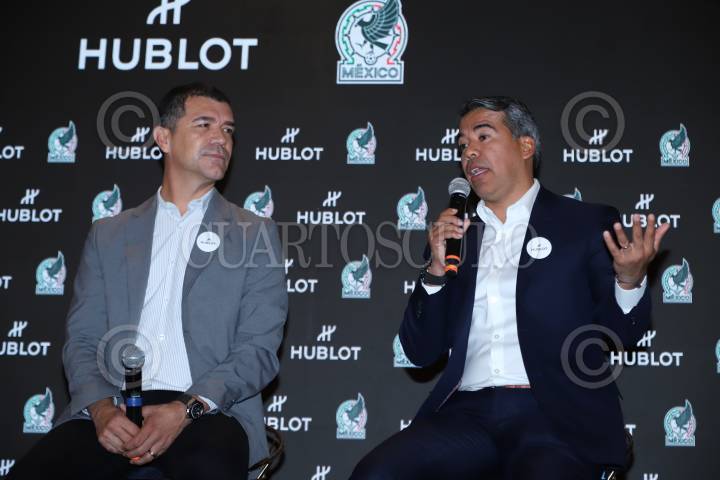 Los exjugadores Jared Borghetti y Pável Pardo durante la presentación de la alianza entre la Selección Mexicana de Fútbol y la marca de relojería Hublot en un conocido hotel sobre a Paseo de la Reforma.