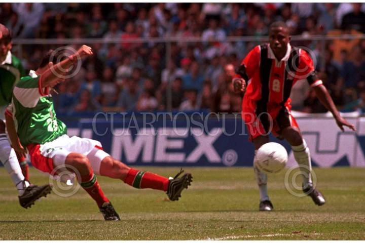 Un jugador del equipo Trinidad y Tobago se queda estupefacto ante el inminente disparo a gol de Jaret Borgetti. FOTO: Christian Palma/CUARTOSCURO.COM