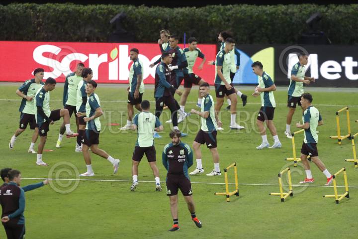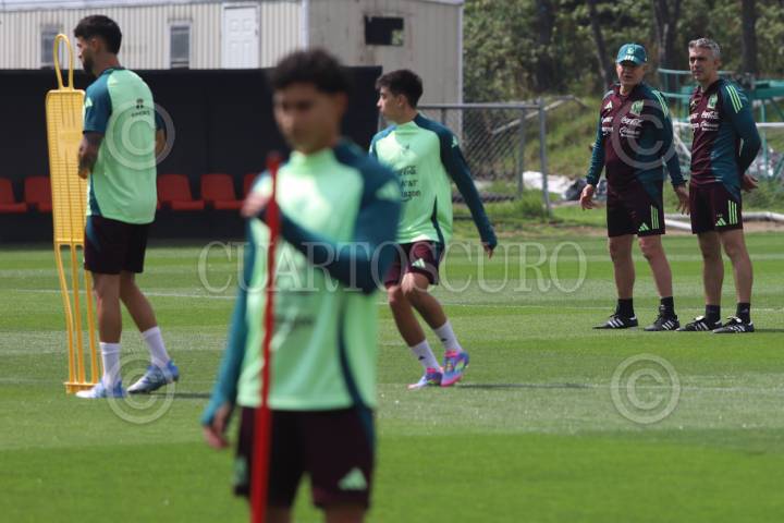 CIUDAD DE MÉXICO, 04JUNIO2025.- Javier Aguirre, técnico de la selección mexicana, dialoga con su auxiliar técnico, Toni Amor, durante el entrenamiento de esta mañana en el CAR. FOTO: DANIEL AUGUSTO/ CUARTOSCURO.COM
