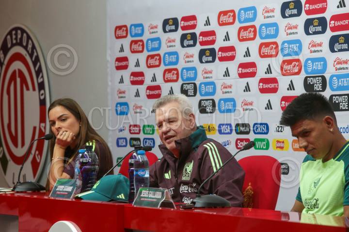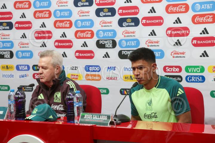 TOLICA, ESTADO DE MÉXICO, 19NOVIEMBRE2024.- Javier Aguirre D. T. de la Selección Nacional de México y el jugador Jesús Gallardo en conferencia de prensa previo a su encuentro ante la Selección de Honduras en su juego de vuelta de los Cuartos de Final de la Concacaf Nations League. FOTO: CRISANTA ESPINOSA AGUILAR /CUARTOSCURO.COM