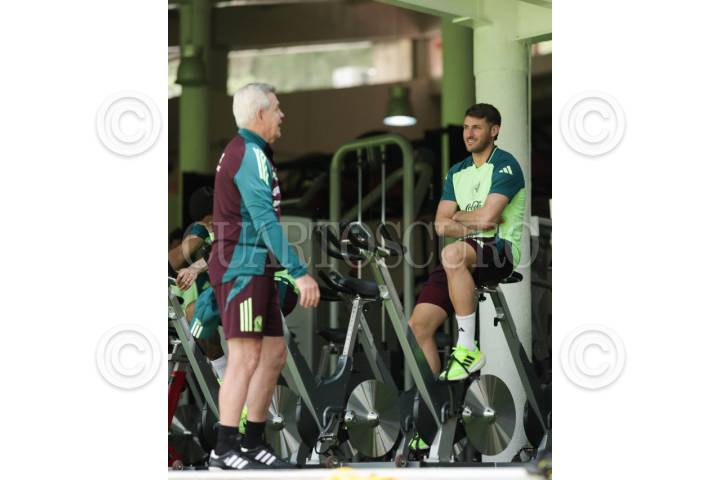 CIUDAD DE MÉXICO, 02JUNIO2025.- Javier "Vasco" Aguirre, técnico de la Selección Nacional, conversa con el delantero, Santiago Giménez, durante la concentración del equipo nacional en el Centro de Alto Rendimiento (CAR). El combinado tricolor se encuentra en preparación para jugar dos partidos amistosos como parte de su preparación para la Copa de Oro. FOTO: CORTESÍA FMF/CUARTOSCURO.COM