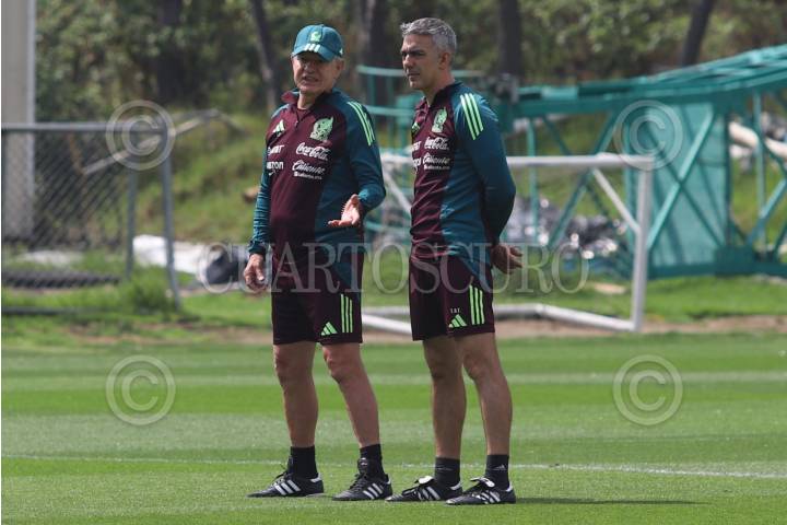 CIUDAD DE MÉXICO, 04JUNIO2025.- Javier Aguirre, director técnico de la selección mexicana, dialoga con su auxiliar técnico, Toni Amor, durante el entrenamiento de esta mañana en el Centro de Alto Rendimiento (CAR), previo a los duelos contr Suiza y Turquía comparte de la preparación del equipo para la Copa Oro. FOTO: DANIEL AUGUSTO/ CUARTOSCURO.COM