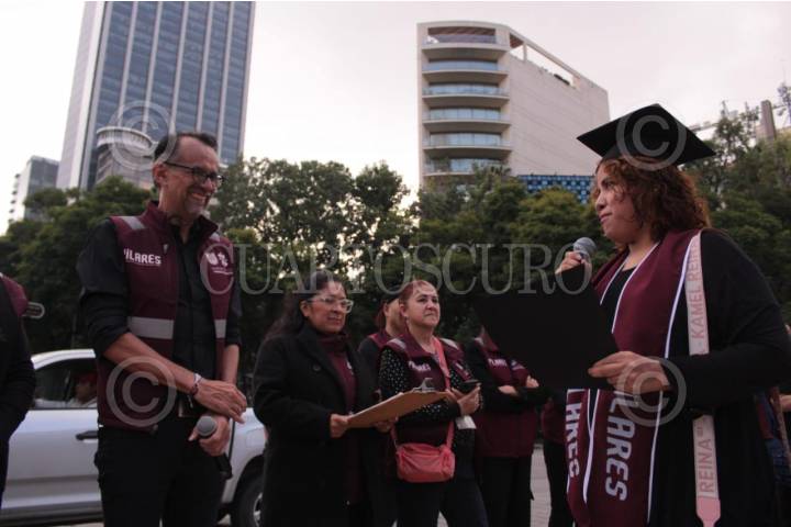 CIUDAD DE MÉXICO, 24AGOSTO2024.- Una joven recién graduada de la preparatoria Puntos de Innovación, Libertad, Arte, Educación y Saberes (PILARES) dedica unas palabras con la presencia de Javier Hidalgo, coordinador del Subsistema de Educación Comunitaria PILARES, durante la reunión de foto de graduación llevada a cabo en el Ángel de la Independencia. FOTO: DANIEL YÁÑEZ/CUARTOSCURO.COM
