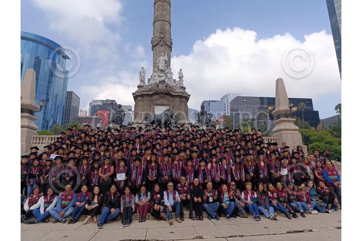 CIUDAD DE MÉXICO, 24AGOSTO2024.- Alumnos de la preparatoria "PILARES" se graduaron y se tomaron la fotografía de su graduación en el Ángel de la Independencia. Acompañados por el personal administrativo y el coordinador, Javier Hidalgo. FOTO: DANIEL YÁÑEZ/CUARTOSCURO.COM