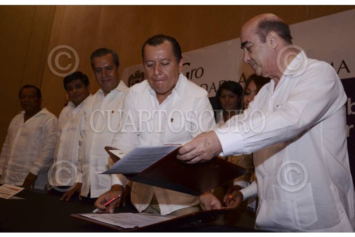 ACAPULCO, GUERRERO, 14AGOSTO2013.- Jesús Murillo Karam, Procurador General de la República, y Javier Saldaña Almazán, rector de la Universidad Autónoma de Guerrero, firmaron un convenio de colaboración entre la PGR y la UAG. El acto se realizó en el marco del Forum Mundo Imperial. FOTO: CUARTOSCURO.COM
