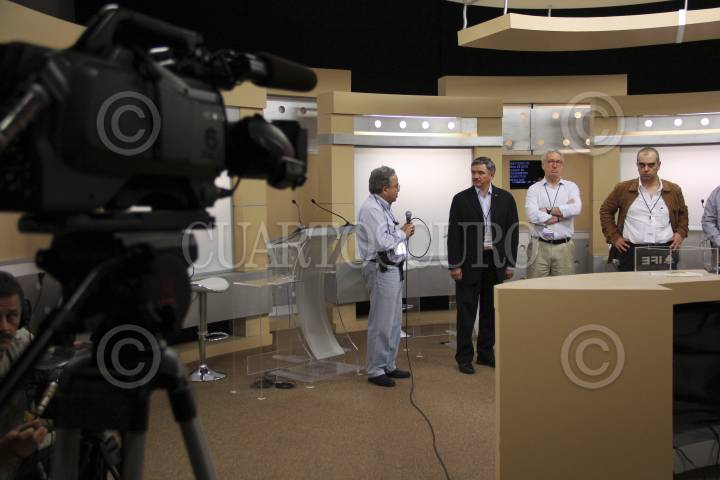 GUADALAJARA, JALISCO, 09JUNIO2012.- El Consejero Presidente, Leonardo Valdez Zurita (segundo izq. a derech.) y el consejero electoral, Alfredo Figueroa Fernandez (cuarto de izq. a derech.) recorrieron la mañana de hoy el foro de televisión donde el día de mañana se llevará acabo el segundo debate presidencial entre los cuatro contendientes, tambien se encontraba en el recorrido el moderador, el periodista Javier Solorzano (tercero de izq. a derch.). FOTO: FERNANDO CARRANZA /CUARTOSCURO.COM