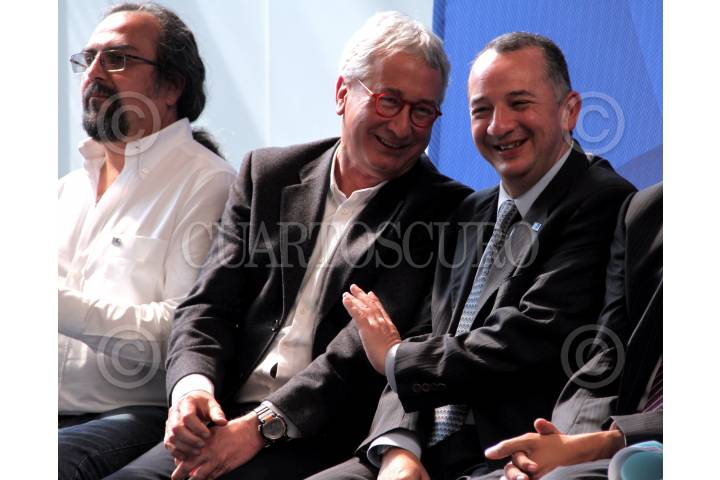 MÉXICO, D.F., 04DICIEMBRE2013.- Javier Solórzano Zinser, periodista mexicano dialoga con José Luis Martínez, director de Radio Educación, durante la ceremonia por el 89 aniversario de radiodifusora pública. FOTO: ADOLFO VLADIMIR /CUARTOSCURO.COM