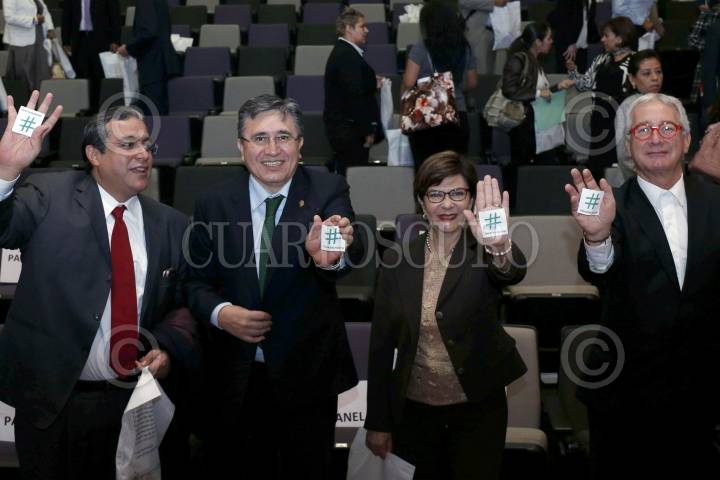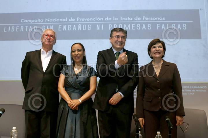 MÉXICO, D.F., 05OCTUBRE2015.- El conductor del canal del Congreso Javier Solórzano; la senadora Adriana Ávila; el presidente de la CNDH Luis Raúl González Pérez y la senadora Angélica de la Peña, presentaron de la Campaña Nacional de Prevención de la Trata de Personas “Libertad sin engaños ni promesas falsas”, que tuvo como sede el Museo de Memoria y Tolerancia. Mediante dicha campaña, se busca visibilizar la realidad y gravedad de este delito, generar conciencia y contribuir a su prevención. En especial, pretende advertir a las adolescentes y mujeres sobre las formas de captación que utilizan los tratantes, entre ellas la seducción, invitándolas a informarse y a cuidarse. Se hará hincapié, también, en el papel que juega la demanda de servicios y productos realizados bajo explotación. FOTO: CNDH /CUARTOSCURO.COM
