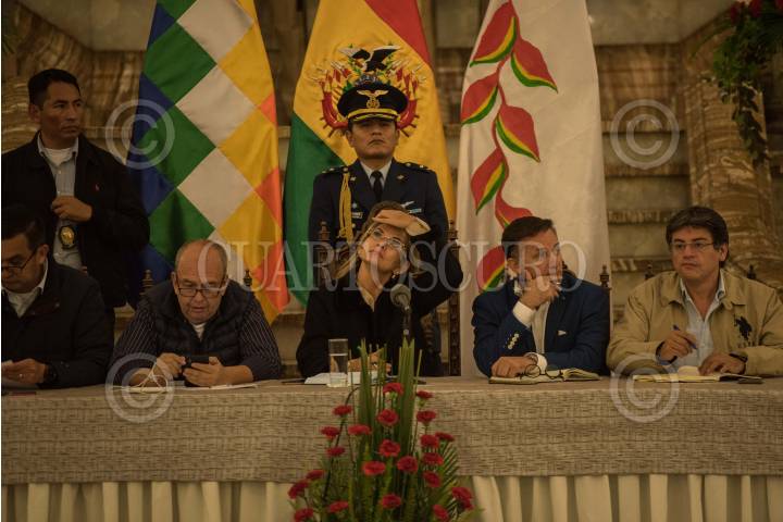 LA PAZ, BOLIVIA, 23NOVIEMBRE2019.- Después de haber rechazado la opción de amnistía para el ex presidente Evo Morales, la presidenta interina de Bolivia, Jeanine Añez, se reunió en el Palacio Nacional con organizaciones sociales, entre ellas la Central Obrera Boliviana. FOTO: PEDRO ANZA /CUARTOSCURO.COM