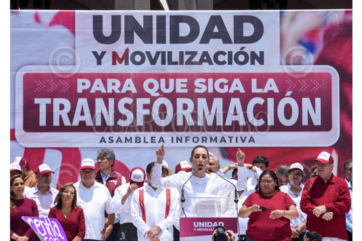 Mara Lezama, Gobernadora electa de Quintana Roo, Lorena Cuellar, Gobernadora de Tlaxcala, Claudia Sheinbaum Jefa de Gobierno de la CDMX y Adán Augusto, Secretario de Gobierno, integrantes de MORENA durante el evento “Unidad y Movilización para que siga la Transformación” en la explanada del Teatro Morelos en la Ciudad de Toluca.