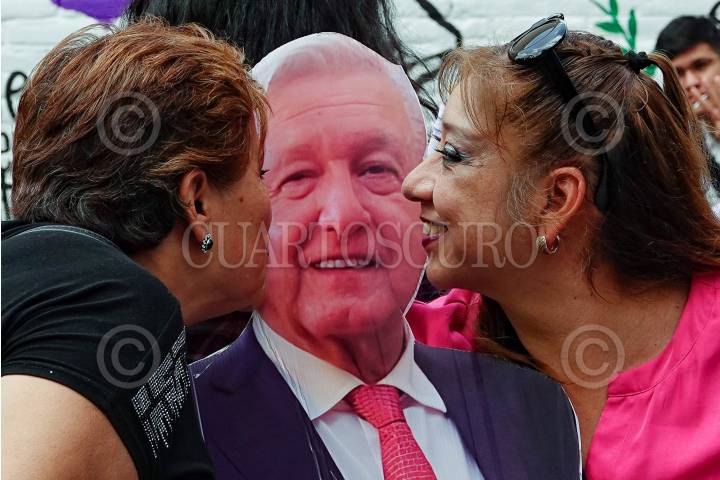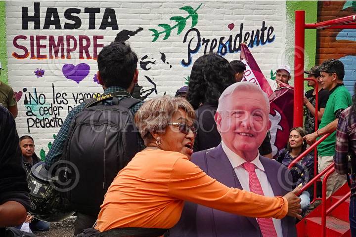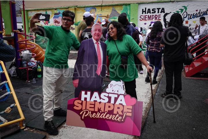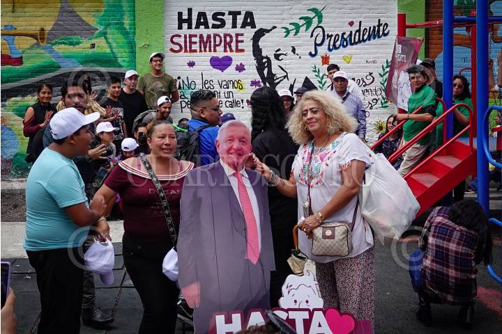 CIUDAD DE MÉXICO, 03AGOSTO2024.- Simpatizantes de Andrés Manuel Lopez Obrador crearon el movimiento, Hasta siempre presidente a dos meses de la salida del mandatario Andrés Manuel Lopez Obrador, en este sentido asistentes a la gira de agradecimiento de Clara Brugada, jefa de Gobierno electa, aprovechan imagen del actual presidente para tomarse fotografías con la imagen de tamaño real en la alcaldía Gustavo A. Madero. FOTO: ROGELIO MORALES /CUARTOSCURO.COM