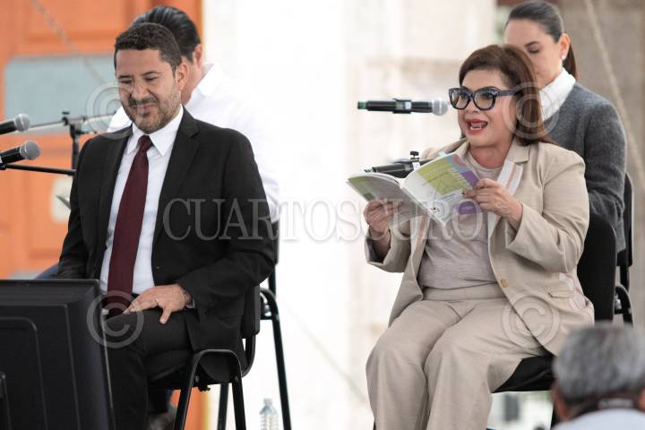CIUDAD DE MÉXICO, 03SEPTIEMBRE2024.- Leticia Ramírez, titular de la SEP; Martí Batres, Jefe de Gobierno; Beatriz Gutiérrez Müller, investigadora y esposa del Presidente de México; Clara Brugada, Jefa de Gobierno Electa, y Mario Delgado, actual presidente de Morena y futuro titular de la SEP, encabezaron la última sesión de los "Fandangos por la Lectura", que se llevaron a cabo Escuela Secundaria Diurna No. 1 "César A. Ruiz", en el Centro Histórico. FOTO: MOISÉS PABLO/CUARTOSCURO.COM