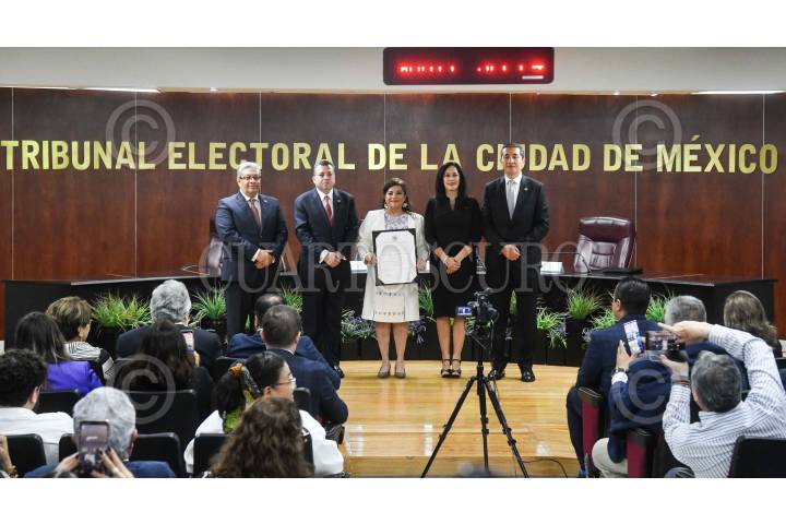 CIUDAD DE MÉXICO, 24SEPTIEMBRE2024.- Clara Brugada, jefa de Gobierno electa, recibió por parte de Armando Ambriz Hernández, magistrado presidente interino del Tribunal Electoral de la Ciudad de México (TECDMX), y de los magistrados electorales: Osiris Vázquez; María Antonieta González, y Juan Carlos Sánchez, la constancia que le da validez como titular de la jefatura de Gobierno luego de los resultados de las elecciones de 2024. FOTO: MARIO JASSO/CUARTOSCURO.COM
