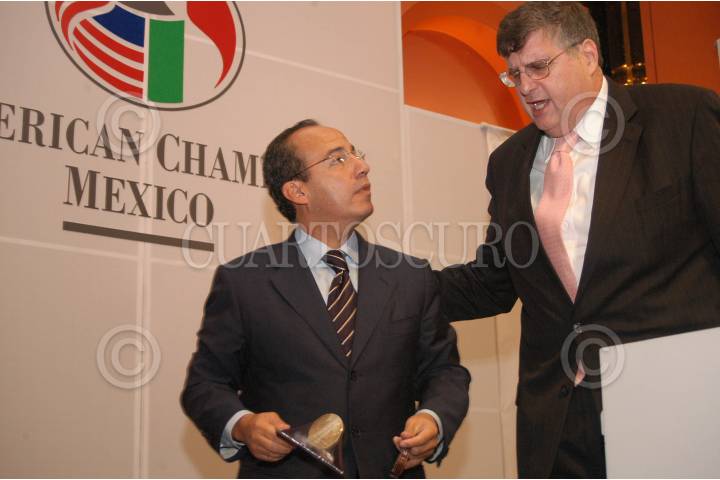 MÈXICO, D.F. 29NOVIEMBRE2005.- Felipe Calderòn Hinojosa, candidato del PAN a la presidencia de la Repùblica y Jeffrey Davidow, ex embajador de EUA de Mèxico durante la convención anual de la American Chamber. FOTO: Miriam Sànchez/CUARTOSCURO.COM