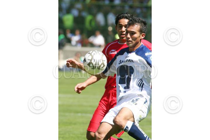 TOLUCA ESTADO DEMÉXICO 11FEBRERO2007.- Con empate a 2 goles concluyo el encuentro entre Pumas de la ENAM y los Diablos Rojos de Toluca en el estadio Nemesio Diez, en imagen Jehu Chiapas (6) se pelea el esferico con un jugador del Toluca. FOTO: CARLOS TISCHLER/CUARTOSCURO.COM