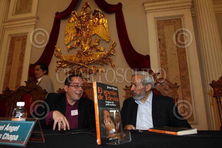 MEXICO, D.F., 26FEBRERO2011.- Los periodistas Jenaro Villamil y Miguel Ángel Granados Chapa, durante la presentación del libro El Sexenio de Televisa del periodista Jenaro Villamil que se realizo como parte de las actividades de la Feria del Libro del Palacio de Mineria. FOTO: RODOLFO ANGULO/CUARTOSCURO.COM