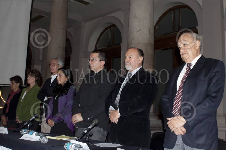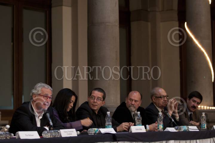 MÉXICO, D.F., 20OCTUBRE2011.- Los periodistas Javier Solórzano, Aleida Calleja, Jenaro Villamil, Francisco José Paoli Bolio, Luis Javier Solana, y Javier Corral, participaron en la mesa de reflexión en torno a la vida profesional del periodista Miguel Ángel Granados Chapa, quien en recientes días falleció. El homenaje fue en el Club de Periodistas. FOTO: MOISÉS PABLO/CUARTOSCURO.COM