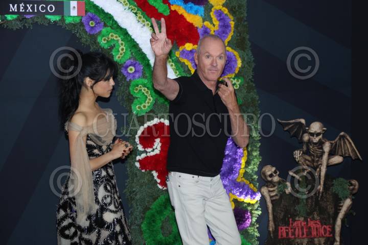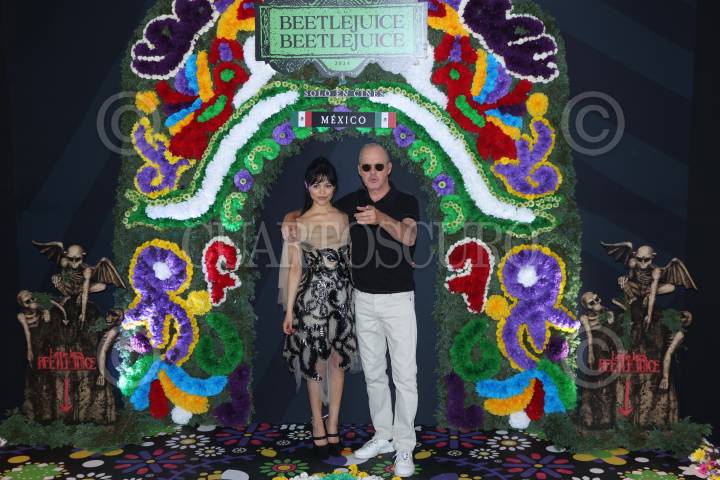 CIUDAD DE MÉXICO, 13AGOSTO2024. Jenna Ortega y Michael Keaton durante el photocall de la película de comedia de terror y fantasía norteamericana “Beetlejuice, Beetlejuice”, en la Ciudad de México. Esta película es una secuela directa de la estrenada en 1988. FOTO: EDGAR NEGRETE LIRA/CUARTOSCURO.COM