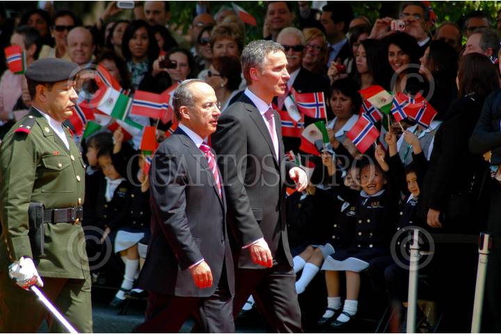 MÉXICO, D.F., 09ABRIL2010.- El presidente Felipe Calderón acompañado del primer ministro de Noruega Jens Stoltenberg durante la revista a la guardia de honor al termino del evento de bienvenida que se celebro en la explanada del monumento a Francisco I. Madero de la residencia oficial de Los Pinos. FOTO: RODOLFO ANGULO/CUARTOSCURO.COM