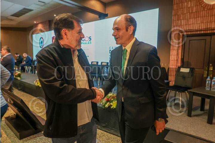 SALTILLO, COAHUILA, 06AGOSTO2024.- Gerardo Fernández Noroña, senador electo del PR, conversa con Jericó Abramo Masso, diputado federal, durante los Diálogos Nacionales para el análisis de la reforma al Poder Judicial, que se llevó a cabo en el Salón Villa Ferre. FOTO: ALEJANDRO RODRÍGUEZ/CUARTOSCURO.COM