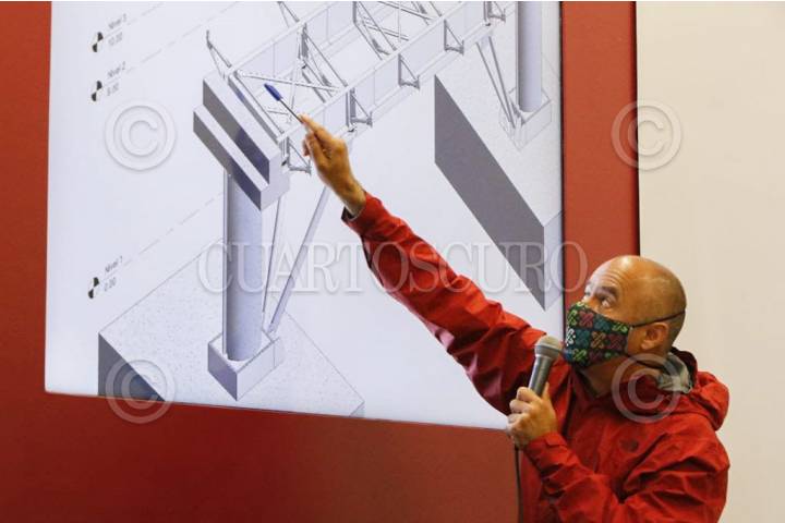 Jesús Antonio Esteva, secretario de Obras y Servicios de la Ciudad de México, durante la conferencia de prensa para hablar del colapso que sufrió la vía elevada de la Línea, que se registró en la estación Oliva, el día de ayer.