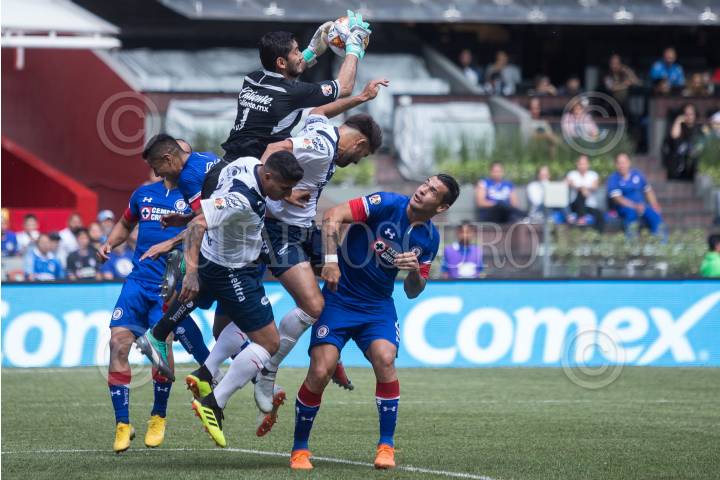 CIUDAD DE MÉXICO, 21JUNIO2018.- Jesús Corona, portero del Cruz Azul, salta para recuperar el balón, durante el partido correspondiente a la jornada 1 del Torneo Apertura 2018 entre Cruz azul y Puebla, llevado acabo en el estadio Azteca. FOTO: ADOLFO VLADIMIR / CUARTOSCURO.COM
