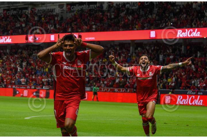 TOLUCA, ESTADO DE MÉXICO, 09NOVIEMBRE2024.- Jesús Gallardo delantero y Ernesto Vega delantero de los Diablos de Toluca festejan su anotación ante la escuadra de las Águilas del América en el partido correspondiente a la jornada 17 del Torneo Apertura 2024 de la LIGA MX, el marcador final 4-0 a favor de la escuadra choricera. FOTO: CRISANTA ESPINOSA AGUILAR /CUARTOSCURO.COM