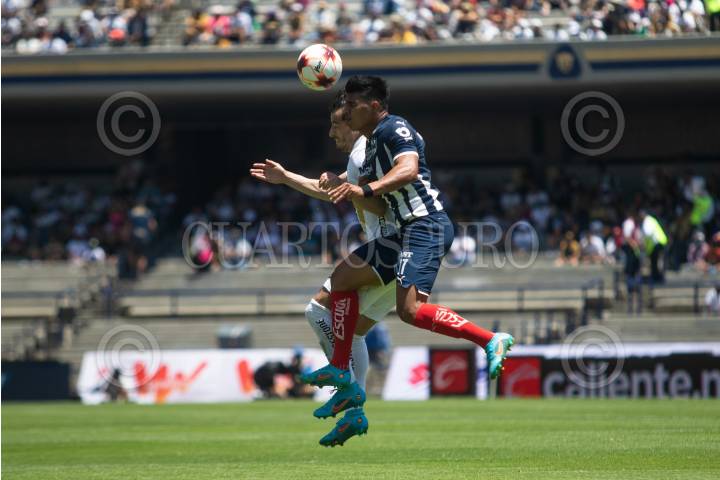 Jesús Gallardo (Monterrey) y Alan Mozo (Pumas) disputan un balón en las alturas.