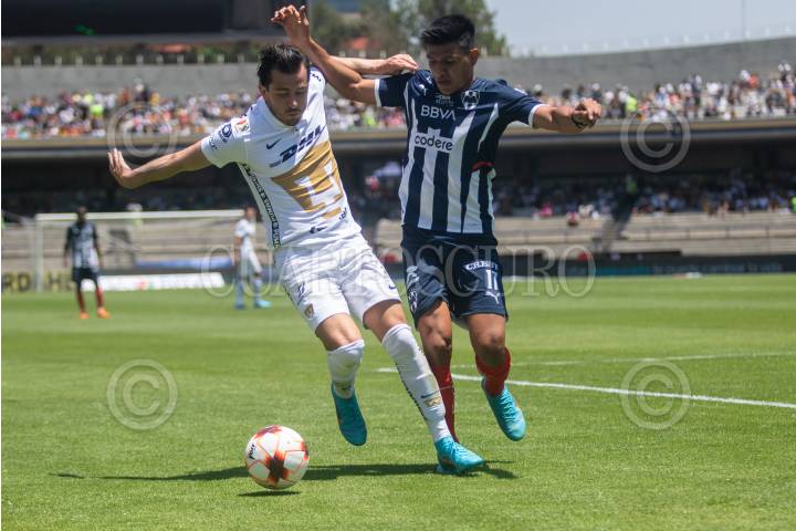Alan Mozo (Pumas) intenta desbordar a Jesús Gallardo (Monterrey), en el partido en que los universitarios ganaron 2-0-