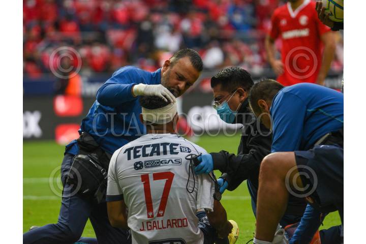 Jesús Gallardo jugador de los Diablos de Toluca es atendido al sufrir un golpe en la cabeza al pelear el esférico durante el encuentro en el estadio Nemesio Diez ante los Diablos de Toluca.