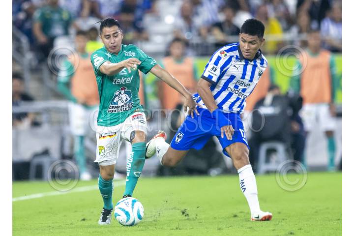 GUADALUPE, NUEVO LEÓN, 16SEPTIEMBRE2023.- Jesús Gallardo de los Rayados del Monterrey, se disputa el balón con José Ramírez de León, en el estadio BBVA, partido correspondiente a la jornada 8 de la Apertura 2023. FOTO: GABRIELA PÉREZ MONTIEL / CUARTOSCURO.COM