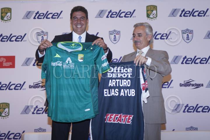 MÉXICO, D.F., 06SEPTIEMBRE2012.- Arturo Elias Ayub del grupo América Móvil y Jesús Martínez presidente del equipo Pachuca de primera división, anunciaron la compra por parte del primero del 35% de las acciones de equipo Tuzo y del recién ascendido Panzas Verdes del León, así como los derechos de transmisión del los esmeraldas al canal UNO propiedad de Carlos Slim. FOTO: FRANCISCO RODRÍGUEZ /CUARTOSCURO.COM