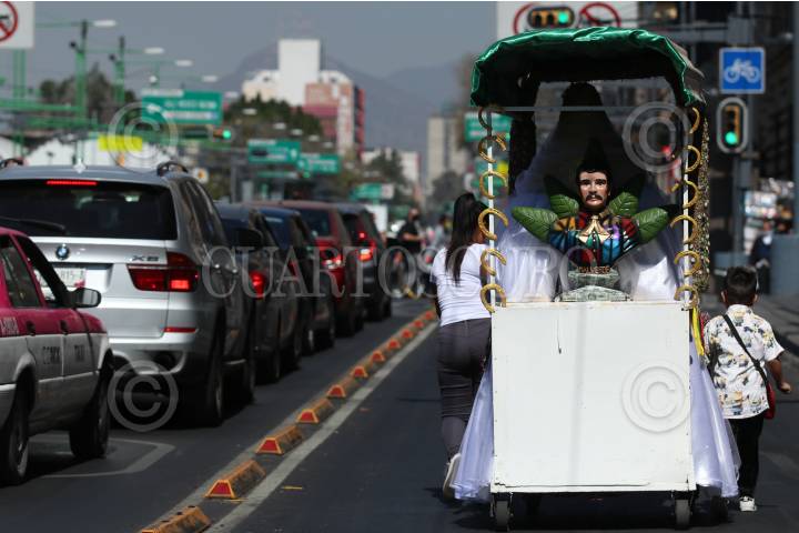 Una imagen de Jesús Malverde es transportada sobre Eje Central.