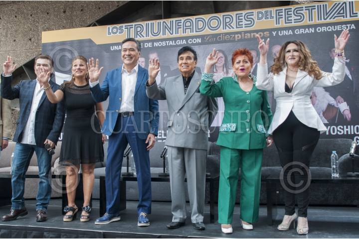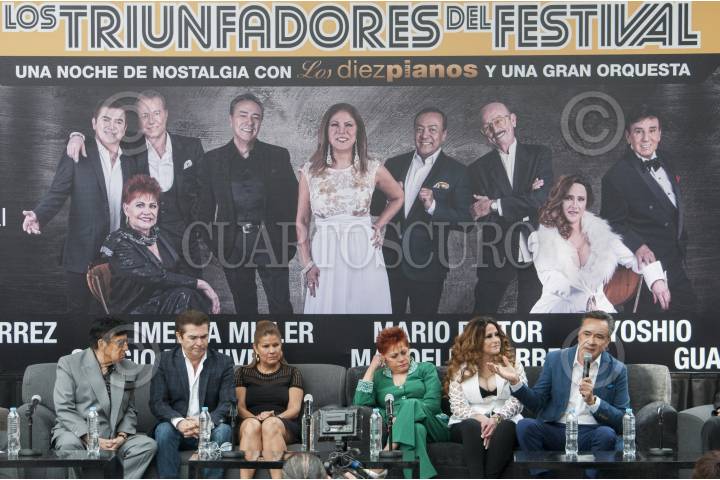 CIUDAD DE MÉXICO, 07MARZO2017.- Los interpretes Jesús Monarrez, Crystal, Yoshio, Gualberto Castro, Imelda Miller y Manoella Torres, ofrecieron una conferencia para anunciar su concierto titulado "Los Triunfadores del Festival", para el próximo 1 de abril en el Auditorio Nacional. En el concierto también participarán Carlos Cuevas, Sergio Esquivel y Mario Pintor. FOTO: DIEGO SIMÓN SÁNCHEZ /CUARTOSCURO.COM